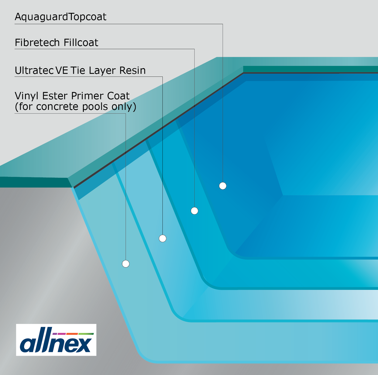 Q: What system do you use for fibreglass pool lining? A: We install a reinforced fibreglass membrane system using matting with a high-grade vinyl ester resin, followed by a vinyl ester fill coat and a UV-stabilised topcoat in your selected colour.